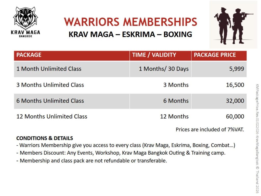 – Members Discount: Any Events, Workshop, Krav Maga Bangkok Outing & Training camp.